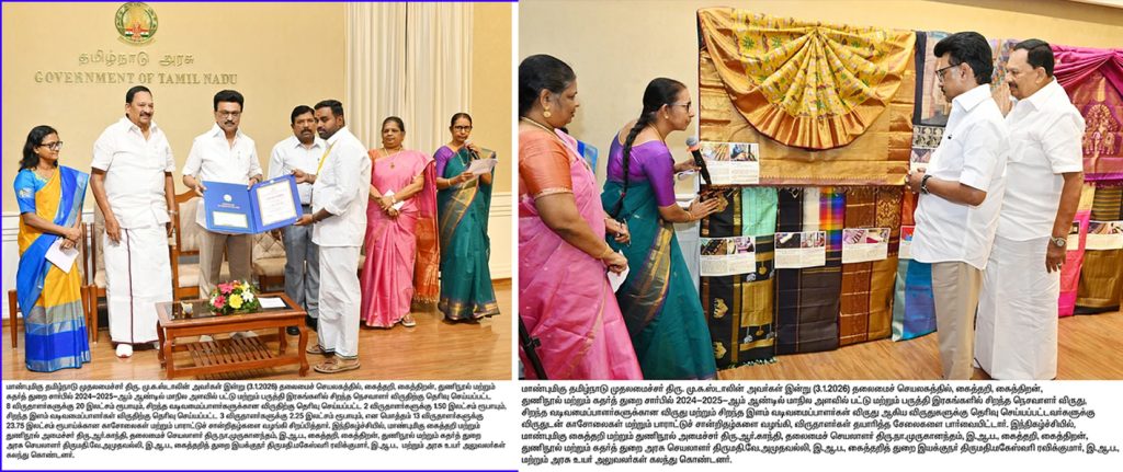 முதலமைச்சர் மு.க.ஸ்டாலின் அவர்க 3.1.2026 அன்று தலைமைச் செயலகத்தில், கைத்தறி, கைத்திறன், துணிநூல் மற்றும் கதர்த் துறை சார்பில் 2024-2025-ஆம் ஆண்டில் மாநில அளவில் பட்டு மற்றும் பருத்தி இரகங்களில் சிறந்த நெசவாளர் விருதிற்கு தெரிவு செய்யப்பட்ட 8 விருதாளர்களுக்கு 20 இலட்சம் ரூபாயும், சிறந்த வடிவமைப்பாளர்களுக்கான விருதிற்கு தெரிவு செய்யப்பட்ட 2 விருதாளர்களுக்கு 1.50 இலட்சம் ரூபாயும், சிறந்த இளம் வடிவமைப்பாளர்கள் விருதிற்கு தெரிவு செய்யப்பட்ட 3 விருதாளர்களுக்கு 2.25 இலட்சம் ரூபாயும், என மொத்தம் 13 விருதாளர்களுக்கு 23.75 இலட்சம் ரூபாய்க்கான காசோலைகள் மற்றும் பாராட்டுச் சான்றிதழ்களை வழங்கி சிறப்பித்தார்.