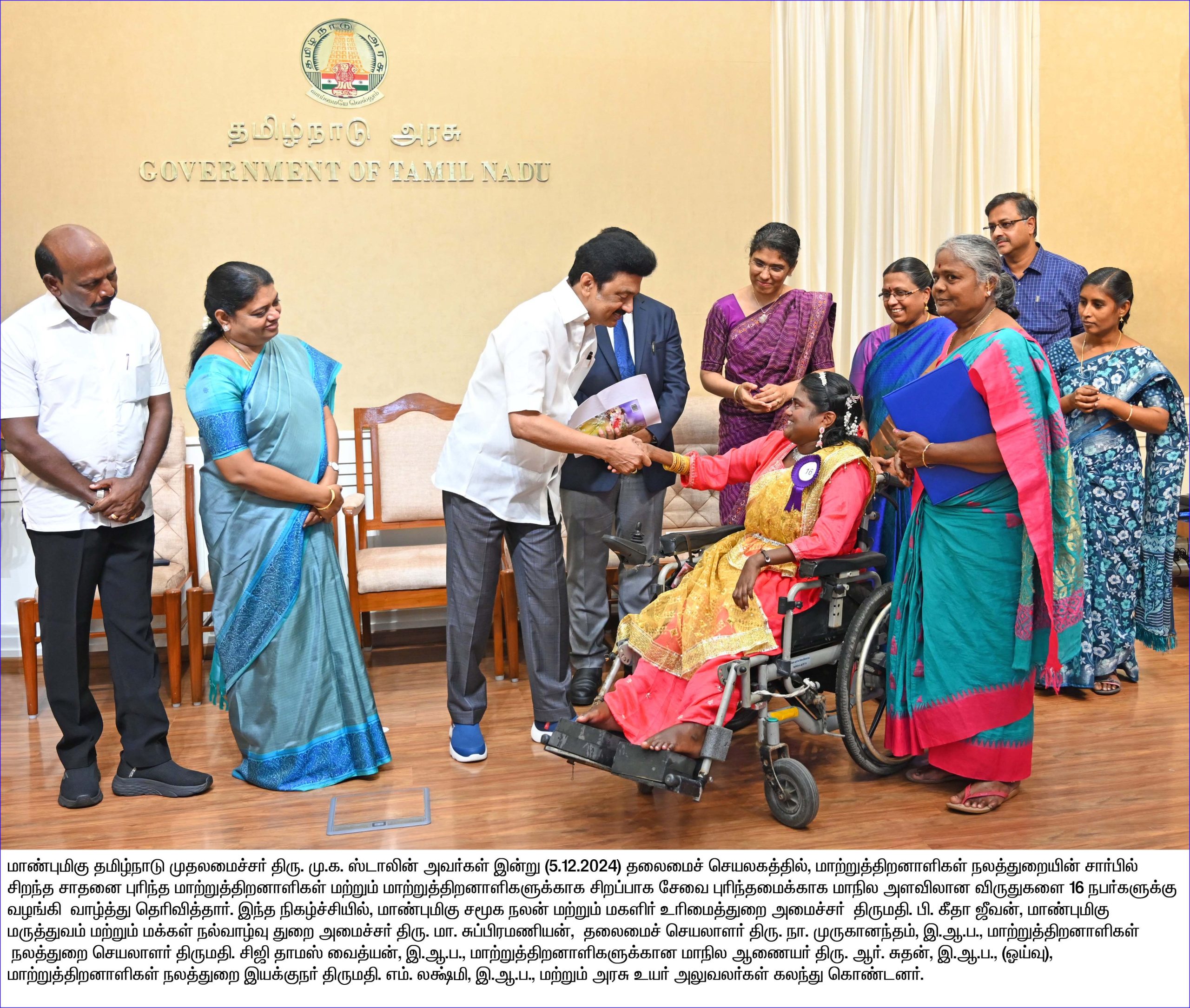 அவ்வழித்தடங்களில் உள்ள மாற்றுத்திறனாளிகளின் தேவைகளுக்கேற்ப இயன்முறை, கேட்டல் மற்றும் பேச்சு பயிற்சி, சிறப்புக் கல்வி ஆகிய மறுவாழ்வு சேவைகள் ஊர்திகளில் வழங்கப்படும். இதை தொடர்ந்து முதல்வர் சிறந்த சாதனை புரிந்த மாற்றுத்திறனாளிகள் மற்றும் மாற்றுத்திறனாளிகளுக்காக சிறப்பாக சேவை புரிந்தமைக்காக மாநில அளவிலான விருதுகளை 16 பேருக்கு வழங்கி வாழ்த்து தெரிவித்தார்.