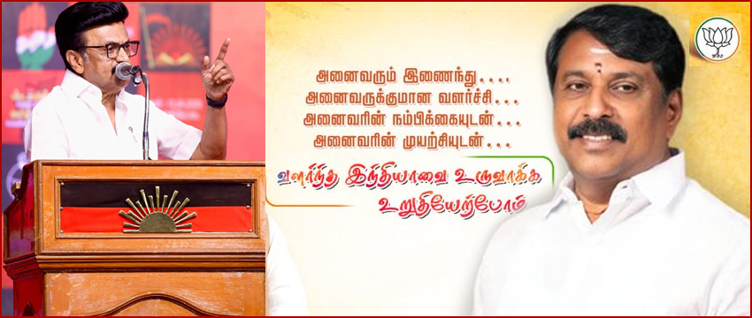 தமிழ், தமிழர், தமிழகத்தின் வளர்ச்சிக்காக அர்ப்பணிப்புடன் 14 லட்சம் கோடி திட்டங்கள் தந்து தமிழகத்தை வளர்ச்சி பாதையில் அழைத்துச் சென்ற பிரதமர் மோடியை தேர்தலுக்காக, இந்திய அரசியல் சட்டத்திற்கு எதிராக, எச்சரிக்கை, மிரட்டல் விடுத்து, மத்திய, மாநில அரசுகளின் மேன்மையான உறவை இழிவுபடுத்தும் வகையில், அரசியல் நாகரிகத்தையும் இந்திய இறையாண்மையும் குழி தோண்டி புதைத்து விட்டார்.
