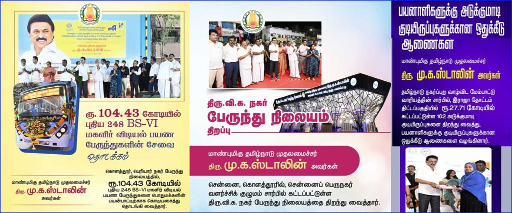 சென்னை: முதலமைச்சர் ஸ்டாலின் இன்று தனது தொகுதியான கொளத்தூர் தொகுதியில்,  248 புதிய பேருந்துகள், புணரமைக்கப்பட்ட திரு.வி.நகர் பேருந்து நிலையம், பெண்களுக்கான அதிநவீன உடற்பயிற்சி கூடம், சிறுவிளையாட்டு அரங்கம், மற்றும்  அடுக்குமாடி குடியிருப்புகளை தொடங்கி வைத்தார் .