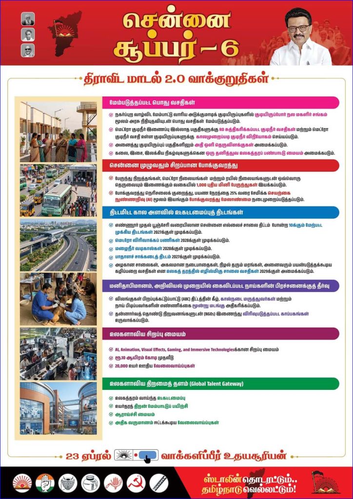 அதில் சென்னைக்கான மேம்படுத்தப்பட்ட பொதுவசதிகள், சென்னை முழுவதும் சிறப்பான போக்குவரத்து, திட்டமிட்ட கால அளவில் உட்கட்டமைப்புத் திட்டங்கள், மனிதாபிமானம்-அறிவியல் முறையில் கைவிடப்பட்ட நாய்களின் பிரச்சினைக்குத் தீர்வு, உலகளாவிய சிறப்பு மையம், உலகளாவிய திறமைத் தளம் (Global Talen Gateway) ஆகிய தலைமைப்புகளிலான “திராவிட மாடல் 2.O வாக்குறுதி”களை வெளியிட்டார்.