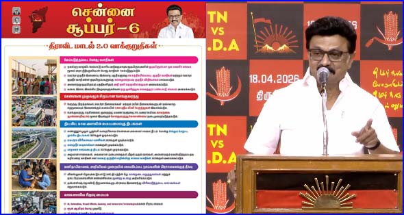 சென்னை: தமிழ்நாடு சட்டமன்ற தேர்தலையொட்டி, சென்னையின் வளர்ச்சிக்கான 6 முக்கிய வாக்குறுதிகளை முதலமைச்சர் ஸ்டாலின் வெளியிட்டார்.