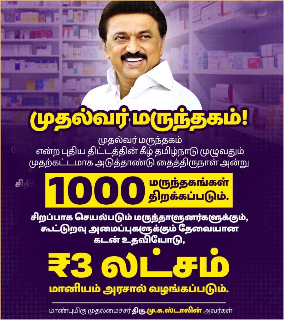 இந்த நிலையில், தமிழ்நாடு அரசு சார்பில், மாநிலம் முழுவதும் குறைந்த விலையில் மருந்து பொருட்கள் விற்பனை செய்யும் வகையில் முதல்வர் மருந்தகங்கள் திறக்க முடிவு செய்யப்பட்டு உள்ளது. அதன்படி சென்னை முதல் குமரி வரை சுமார் 1000 இடங்களில் முதல்வர் மருந்துகங்கள் அமைக்கப்பட்டு வருகிறது. இந்த மருந்துகங்களை பிப்ரவரி 24-ல் முதல்வர் மு.க.ஸ்டாலின் தொடங்கி வைக்கிறார்.