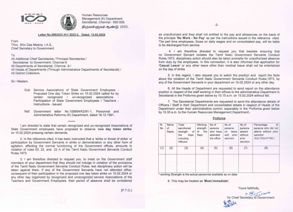 போராட்டம் நடைபெறும் 15 ஆம் தேதி மருத்துவ விடுப்பு தவிர மற்ற விடுப்புக்கள் அளிக்கக்கூடாது. ஆகவே அன்றைய தினம் காலை 10.15 மணிக்குள் உங்கள் துறையில் உள்ள பணியாளர்களின் வருகை பற்றி அரசுக்குத் தெரிவிக்க வேண்டும்.”