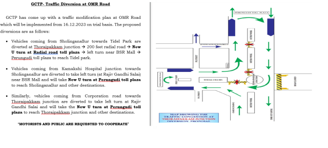 ”சென்னை மாநகர போக்குவரத்து காவல்துறை ஓஎம்ஆர் சாலையில் போக்குவரத்து மாற்றத் திட்டத்தைக் கொண்டு வந்துள்ளது. இது சோதனை அடிப்படையில் 16.12.2023 முதல் செயல்படுத்தப்படும். முன்மொழியப்பட்ட திசைதிருப்பல்கள் பின்வருமாறு: