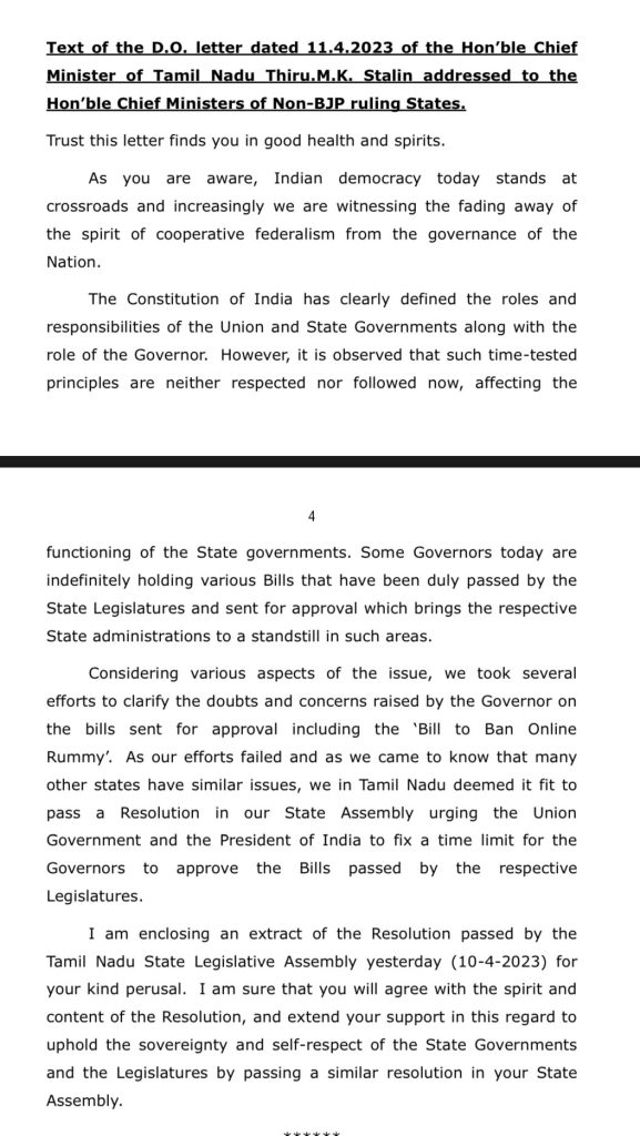 தமிழக முதலமைச்சரின் அந்த கடிதத்தில், இந்தியாவில் மக்களாட்சி இன்று முக்கியமான கட்டத்தில் உள்ளது என்பதையும், நமது நாட்டில் கூட்டாட்சி தத்துவம் என்பது படிப்படியாக மறைந்து வருவதையும் காண்கிறோம் என்று குறிப்பிட்டுள்ளார்.