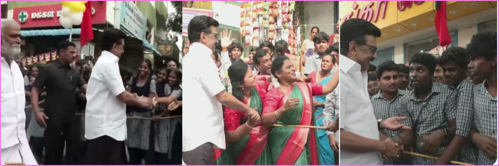 முன்னதாக நிகழ்ச்சிக்கு வந்த முதல்வர் ஸ்டாலினுக்கு சாலையின் இருமங்கிலும் பள்ளி மாணவர்கள், குடும்பதலைவிகள், கட்சியினர் என பல தரப்பினரும் கூடி நின்று வரவேற்றதுடன், பலர் செல்ஃபி எடுத்தும் மகிழ்ந்தனர்.