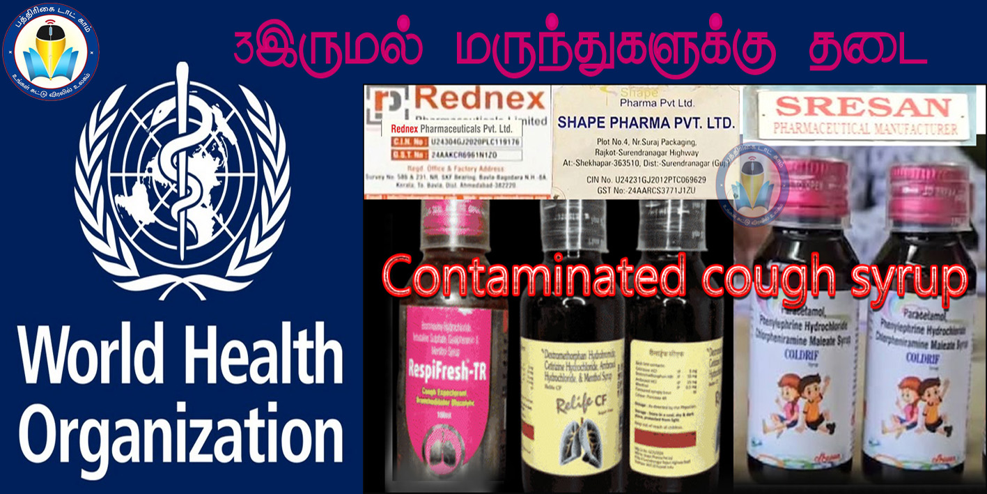 இந்தியாவில் பல குழந்தைகளின் இறப்புக்குக் காரணமானதாக நம்பப்படும் மூன்று இருமல் சிரப்களின் பயன்பாடு மற்றும் விநியோகத்திற்கு எதிராக உலக சுகாதார அமைப்பு (WHO) திங்களன்று சுகாதார ஆலோசனை எச்சரிக்கையை வெளியிட்டது. மாசுபட்ட இருமல் சிரப் என இந்த மருந்துகளை கூறியுள்ளது.