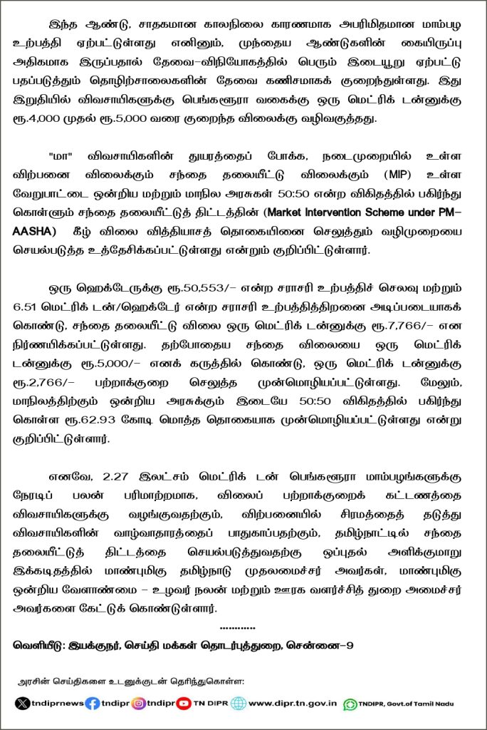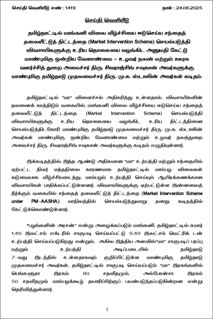 தமிழ்நாட்டில் மாங்கனி விலை வீழ்ச்சியை ஈடுசெய்ய சந்தைத் தலையீட்டுத் திட்டத்தை (Market Intervention Scheme) செயல்படுத்தி விவசாயிகளுக்கு உரிய தொகையை வழங்கிட அனுமதி கேட்டும், மாம்பழக் கூழுக்கான ஜிஎஸ்டியை 12 விழுக்காட்டிலிருந்து 5 விழுக்காடாகக் குறைத்திட வேண்டும் என மத்திய வேளாண்மை உழவர் நலன் மற்றும் ஊரக வளர்ச்சித் துறை அமைச்சர் சிவராஜ்சிங் சவுகானுக்கு தமிழ்நாடு முதலமைச்சர் ஸ்டாலின் கடிதம் எழுதி உள்ளார்.