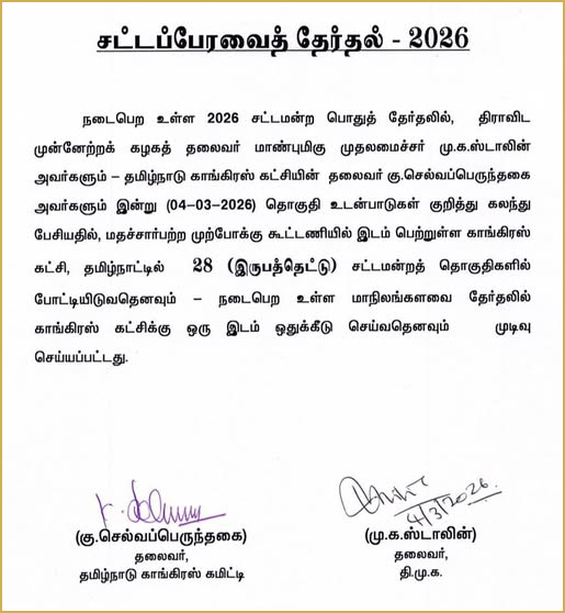 அப்போது, திமுக வழங்கிய 28 சட்டப்பேரவை தொகுதிகள் மற்றும் ஒரு மாநிலங்களவை உறுப்பினர் இடத்தை காங்கிரஸ் ஏற்றுக் கொண்டது. இதற்கான ஒப்பந்தத்தில் முதல்வர் மு.க.ஸ்டாலின், செல்வப்பெருந்தகை கையெழுத்திட்டனர்.