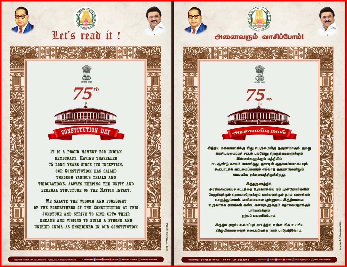 அரசமைப்புச் சட்டத்தின் 75-ஆவது ஆண்டு தினத்தையொட்டி, அதனுடைய முகப்புரை இணைக்கப்பட்ட கடிதத்தை தமிழக அரசு வெளியிட்டு உள்ளது.
