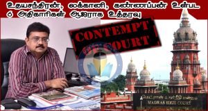 சென்னை: சென்னை உயர்நீதிமன்ற அவமதிப்பு வழக்குகளில் அரசு அதிகாரிகளை கடுமையாக சாடி வருவதுடன், 5 ஐஏஎஸ் அதிகாரிகள் உள்பட 6 அதிகாரிகள் நேரில் ஆஜராக உத்தரவிட்டு உள்ளது. இது அதிகாரிகள் மத்தியில் சலசலப்பை ஏற்படுத்தி உள்ளது. ஏற்கனவே நீதிமன்ற அவமதிப்பு வழக்கில், சென்னை மாநகராட்சி ஆணையர் குமரகுருபன், தொடர்ந்து ஐஏஎஸ் அதிகாரிகள் அமுதா உள்பட 5 பேர் நீதிமன்றத்தில் ஆஜராகி மன்னிப்பு கோரிய நிலையில், தற்போது மற்றொரு வழக்கில் உதயசந்திரன் ஐஏஎஸ் உள்பட 5 அதிகாரிகள் நீதிமன்றத்தில் … Continue reading நீதிமன்ற அவமதிப்பு வழக்கு: உதயசந்திரன் ஐ.ஏ.எஸ். உள்பட 6 அதிகாரிகள் நேரில் ஆஜராக உயர்நீதிமன்றம் உத்தரவு