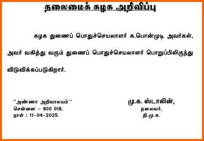 இந்த நிலையில், தி.மு.க துணை பொதுச்செயலாளர் பதவியில் இருந்து அமைச்சர் பொன்முடி நீக்கப்படுவதாக, கட்சி தலைவரும், முதலமைச்சருமான ஸ்டாலின் அறிவித்துள்ளார்.