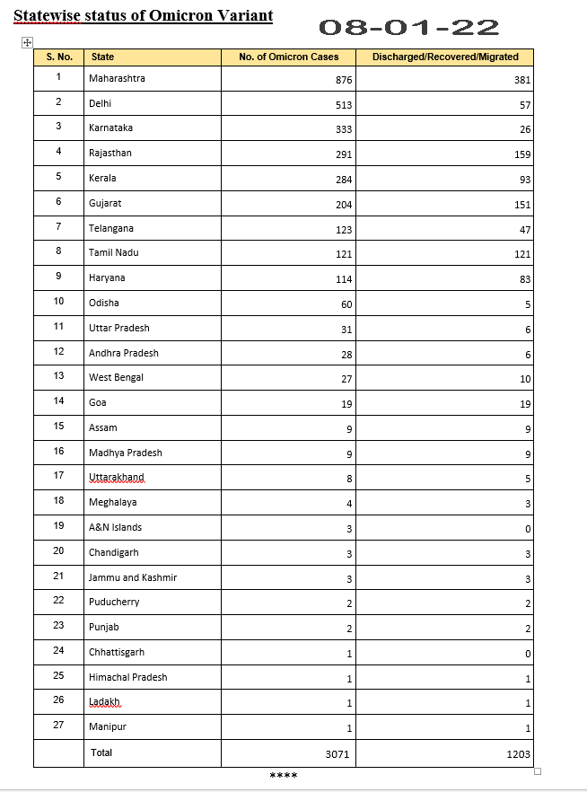 இந்தியாவில் ஒமிக்ரான் தொற்றால் பாதிக்கப்பட்டவர்களின் எண்ணிக்கை 3,071 ஆக பதிவாகியுள்ளது. அவர்களில் இதுவரை 1203 பேர் குணமடைந்துள்ளனர்.