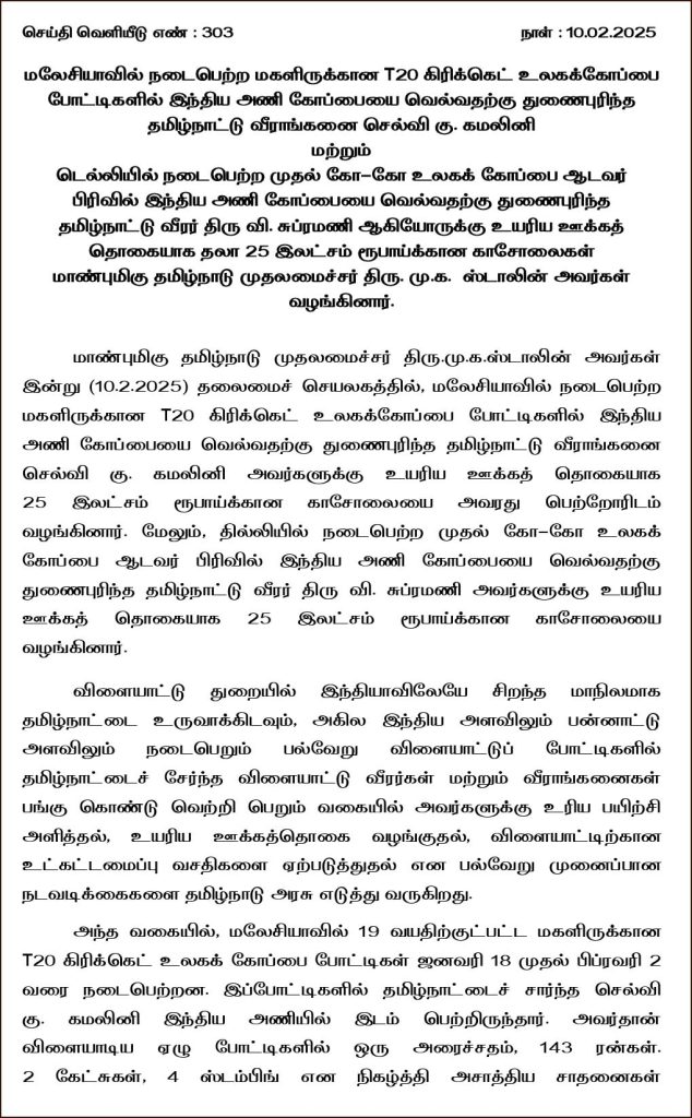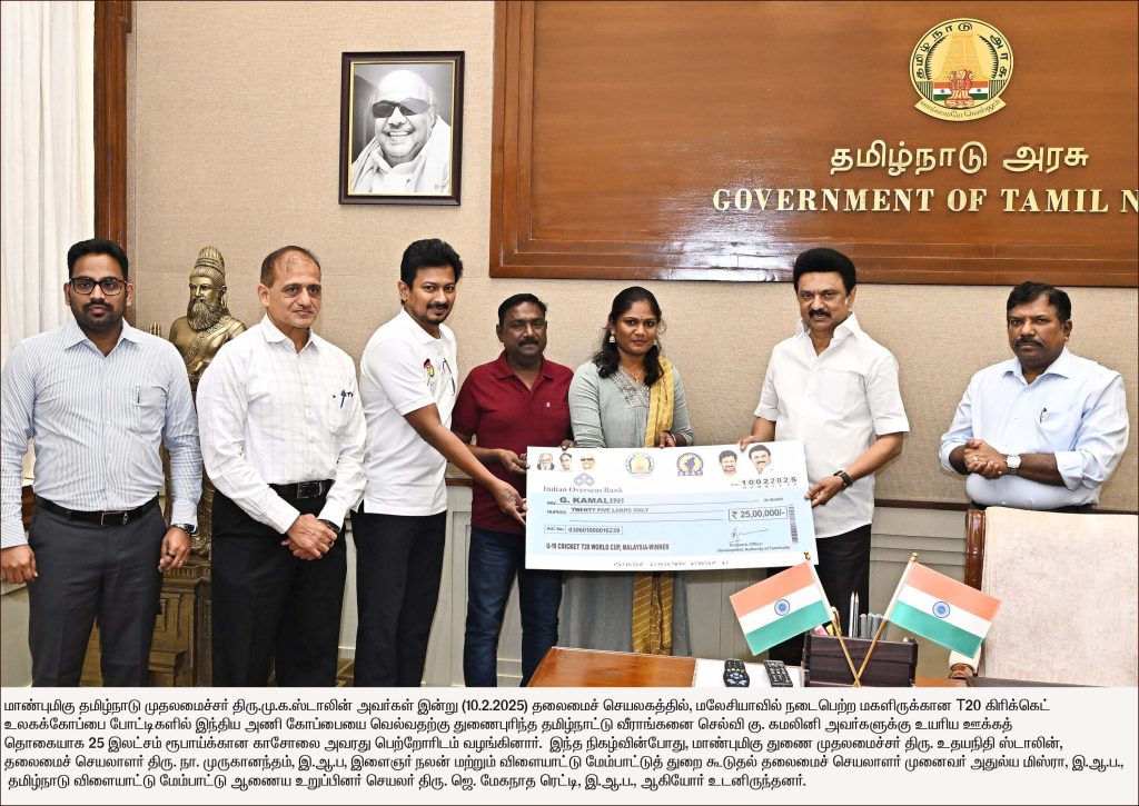 மகளிருக்கான T20 கிரிக்கெட் உலகக்கோப்பை போட்டிகளில் இந்திய அணி கோப்பையை வெல்வதற்கு துணைபுரிந்த தமிழ்நாட்டு வீராங்கனை செல்வி கு.கமலினி அவர்களுக்கு உயரிய ஊக்கத் தொகையாக 25 இலட்சம் ரூபாய்க்கான காசோலை அவரது பெற்றோரிடம் முதலமைச்சர் ஸ்டாலின் வழங்கினார்.