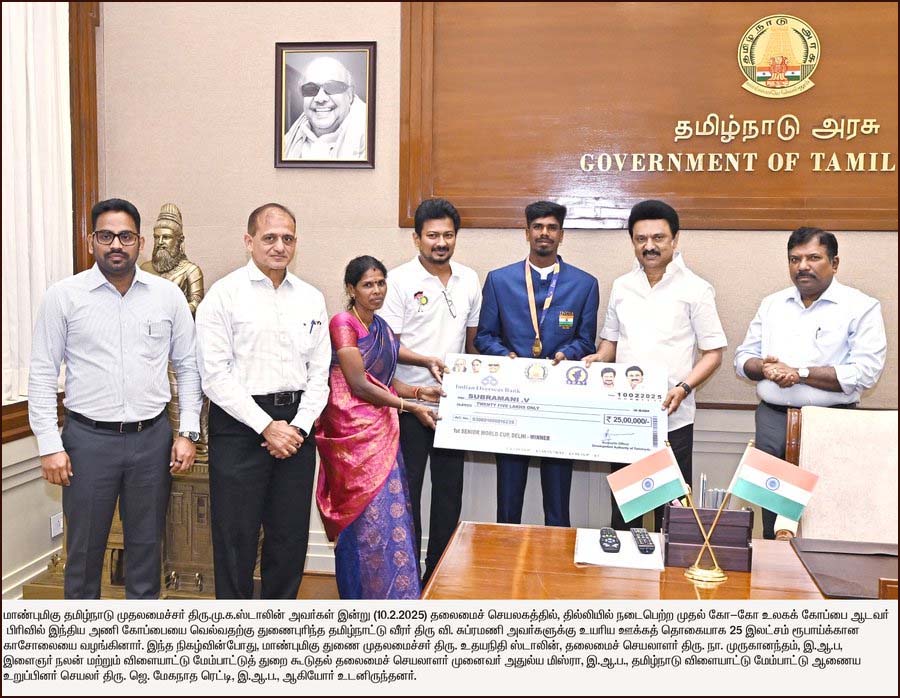தலைநகர் டெல்லியில் நடைபெற்ற முதல் கோ-கோ உலகக் கோப்பை ஆடவர் பிரிவில் இந்திய அணி கோப்பையை வெல்வதற்கு துணைபுரிந்த தமிழ்நாட்டு வீரர் வி.சுப்ரமணி அவர்களுக்கு உயரிய ஊக்கத் தொகையாக 25 இலட்சம் ரூபாய்க்கான காசோலையை முதலமைச்சர் ஸ்டாலின் வழங்கினார்.
