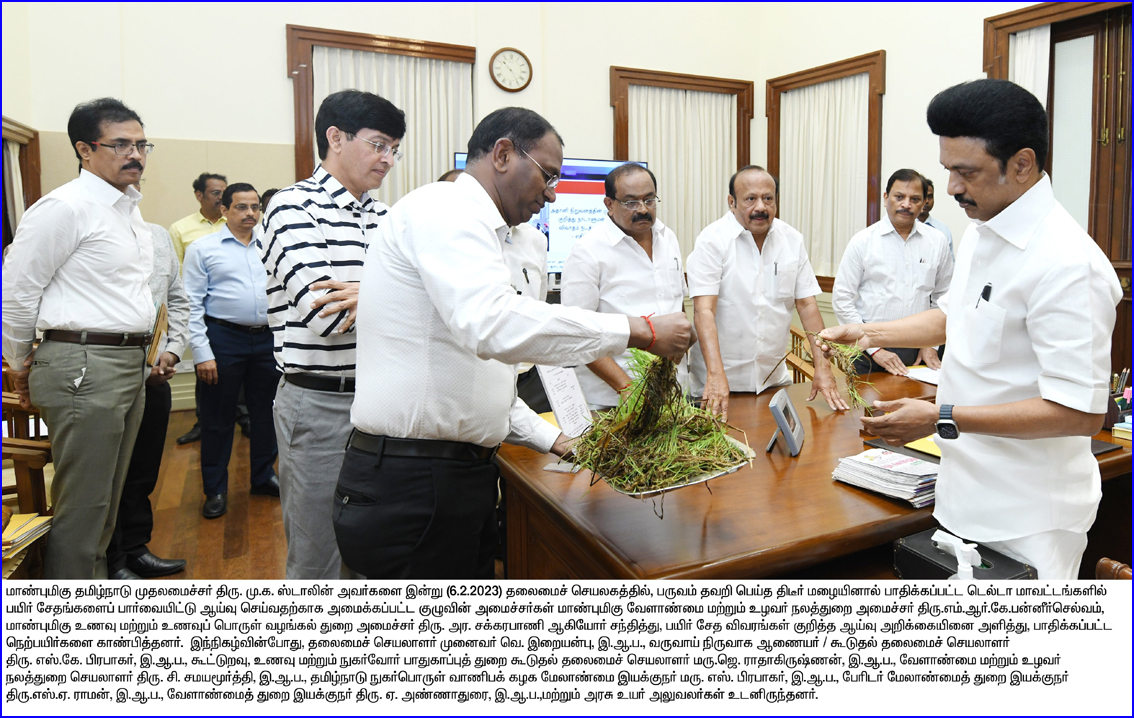 இன்று தலைமைச் செயலகத்தில் நடைபெற்ற ஆலோசனைக் கூட்டத்தில் வேளாண்மை மற்றும் உழவர் நலத்துறை அமைச்சர், உணவுத்துறை அமைச்சர், தலைமைச் செயலாளர், கூடுதல் தலைமைச் செயலாளர் / வருவாய் நிர்வாக ஆணையர், உணவுத் துறை கூடுதல் தலைமைச் செயலாளர், வேளாண்மைத் துறை செயலாளர் மற்றும் அரசு உயர் அலுவலர்கள் உடனிருந்தனர்.