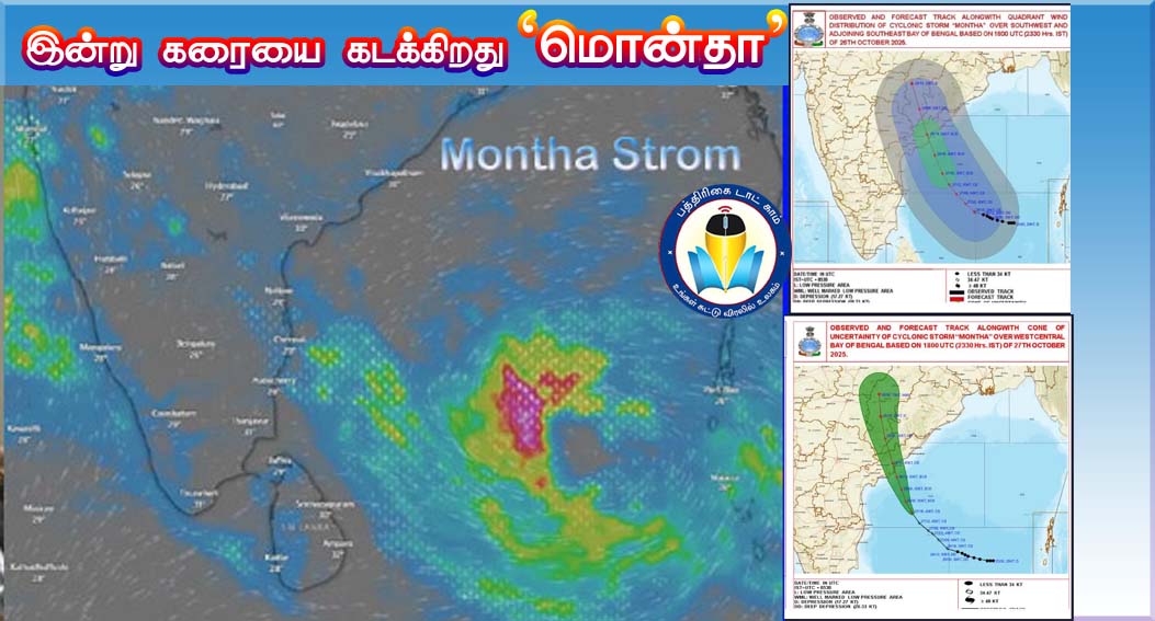 கடந்த 26-ந்தேதி இரவு சென்னை, தென்மேற்கு வங்கக்கடல் பகுதியில் உருவான காற்றழுத்த தாழ்வு மண்டலமாக மோந்தா புயல் நிலவியது. இது நேற்று காலை 11.30 மணி அளவில் 17 கிலோ மீட்டர் வேகத்தில் வட மேற்கு திசை நோக்கி நகர்ந்து கொண்டு இருக்கிறது. குறிப்பாக சென்னைக்கு கிழக்கே 480 கிலோ மீட்டர் தொலைவில் நகர்ந்து கொண்டிருக்கிறது. இது தீவிர புயலாக வலுப்பெற்று ஆந்திர மாநிலம் காக்கிநாடா அருகே இன்று காலை அல்லது மாலை கரையை கடக்கும். புயல் கரையை கடக்கும் என அறிவிக்கப்பட்டுள்ளது.