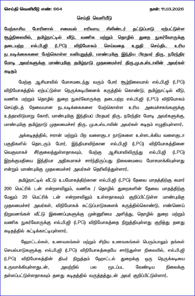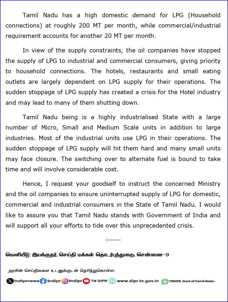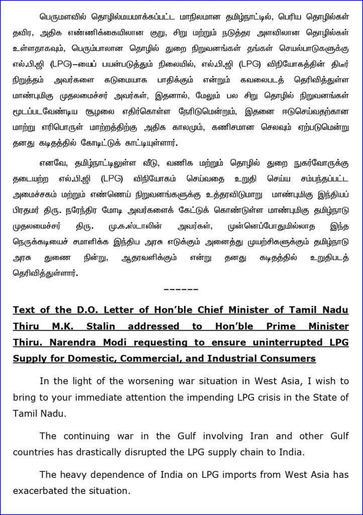 தமிழ்நாட்டில் வீடு, வணிக மற்றும் தொழில் துறை நுகர்வோருக்கு தடையற்ற எல்.பி.ஜி (LPG) விநியோகம் செய்வதை உறுதி செய்திட உரிய நடவடிக்கை களை மேற்கொள்ள வலியுறுத்தி, ந்திய பிரதமர் மோடிக்கு முதலமைச்சர் ஸ்டாலின கடிதம் எழுதி உள்ளார்.