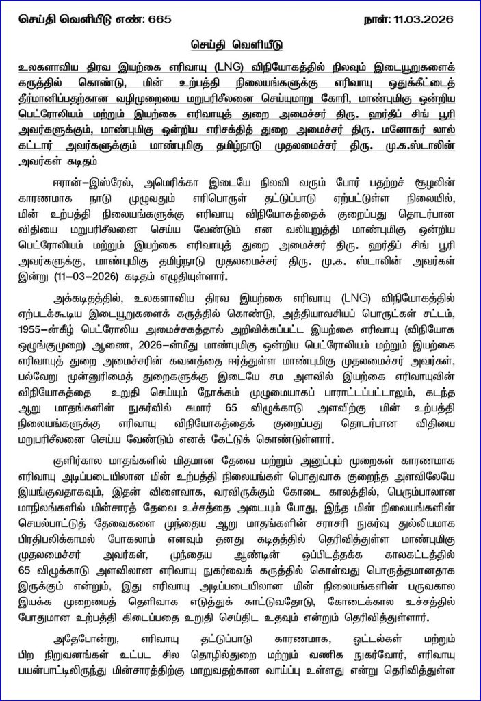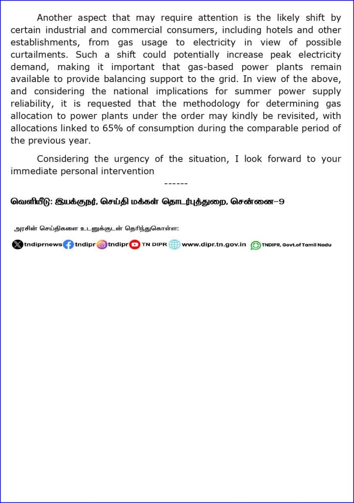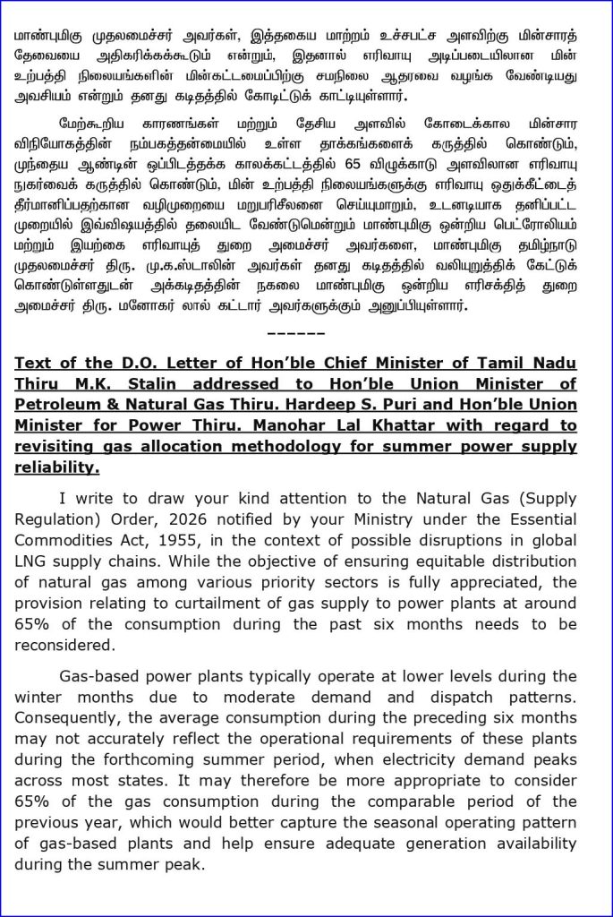 மற்றொரு கடிதத்தில், மின் உற்பத்தி நிலையங்களுக்கு எரிவாயு விநியோகத்தைக் குறைப்பது தொடர்பான விதியை மறுபரிசீலனை செய்ய வேண்டும் என வலியுறுத்தி மாண்புமிகு ஒன்றிய பெட்ரோலியம் மற்றும் இயற்கை எரிவாயுத் துறை அமைச்சர் HardeepSPuri அவர்களுக்கு, முதலமைச்சர் ஸ்டாலின் கடிதம் எழுதி உள்ளார்.