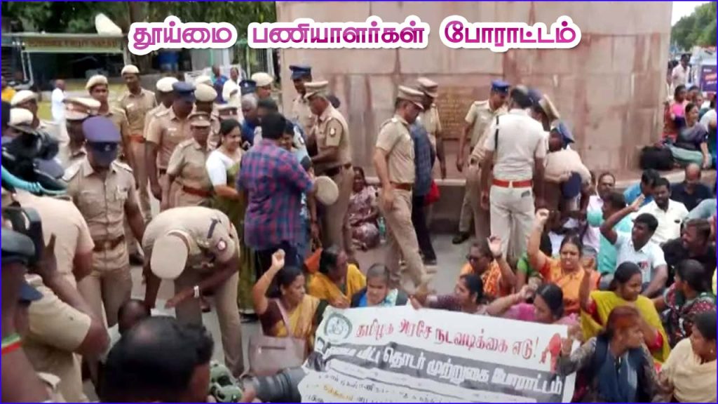 இதை கண்டித்து, அவ்வப்போது மாநகராட்சி தூய்மை பணியாளர்கள் தொடர் போராட்டங்களை நடத்தி வருகின்றனர். செப்டம்பர் 10ந்தி அன்று சென்னை கடற்கரை உழைப்பாளர் சிலை அருகே போராட்டம் நடத்தினர். அவர்களின் போராட்டங்களை காவல்துறை மூலம் தமிழ்நாடு அரசு தடுத்தும், கைது செய்தும் வருகிறது.