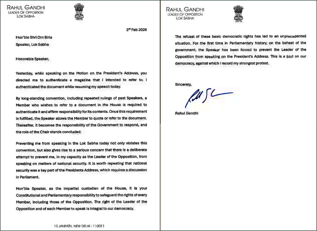 இது தொடர்பாக, மக்களவைத் தலைவர் ஓம் பிர்லாவுக்கு ராகுல் காந்தி எழுதியுள்ள கடிதத்தில், குடியரசுத் தலைவர் உரை மீதான விவாதத்தின் போது தான் பேச அனுமதிக்கப்படவில்லை என்று காங்கிரஸ் தலைவர் கூறினார். திங்களன்று தான் பேசிக்கொண்டிருந்தபோது, ​​2020-ஆம் ஆண்டு இந்தியா-சீனா மோதல் குறித்துப் பேசும்போது தான் குறிப்பிடவிருந்த ஒரு பத்திரிகையைச் சரிபார்க்குமாறு சபாநாயகர் தன்னிடம் கூறியதாக காந்தி குறிப்பிட்டார்.