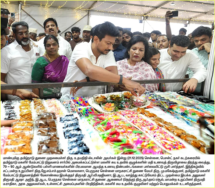 சென்னை, பெசன்ட் நகர் கடற்கரையில் மகளிர் சுய உதவிக் குழுக்கள் தயாரிக்கும் உணவுப் பொருட்களின் உணவுத் திருவிழாவை துணை முதலமைச்சர் உதயநிதி ஸ்டாலின் அவர்கள் இன்று (21.12.2025) திறந்து வைத்து பார்வையிட்டார். அரங்கங்களில் மகளிர் சுய உதவிக்குழுவினரால் தயாரிக்கப்பட்ட பாரம்பரிய, சைவ, அசைவ, சிறு தானிய உணவுப் பொருட்களை ருசி பார்த்து செய்முறை மற்றும் விற்பனை அனுபவம் குறித்து கலந்துரையாடினார்.