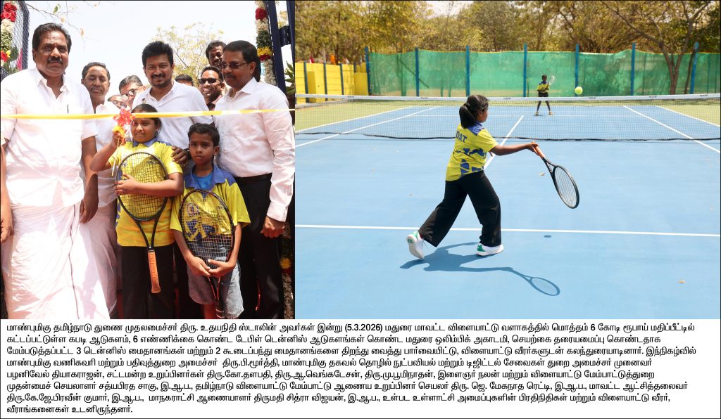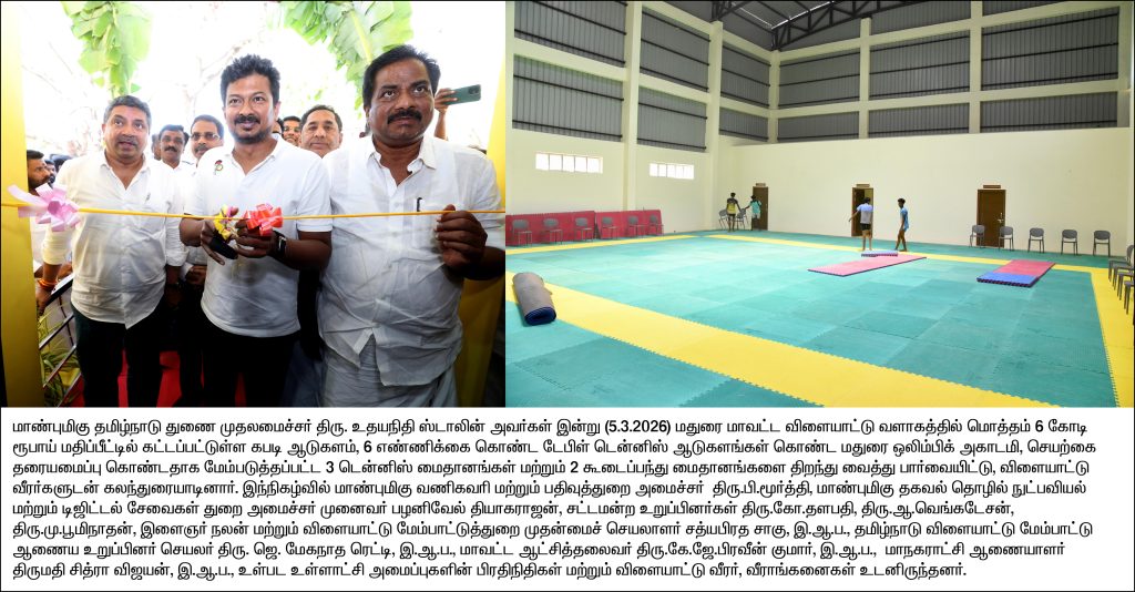 தமிழ்நாடு துணை முதலமைச்சர் உதயநிதி ஸ்டாலின் அவர்கள் இன்று (5.3.2026) மதுரை மாவட்ட விளையாட்டு வளாகத்தில் மொத்தம் 6 கோடி ரூபாய் மதிப்பீட்டில் கட்டப்பட்டுள்ள கபடி ஆடுகளம், 6 எண்ணிக்கை கொண்ட டேபிள் டென்னிஸ் ஆடுகளங்கள் கொண்ட மதுரை ஒலிம்பிக் அகாடமி, செயற்கை தரையமைப்பு கொண்டதாக மேம்படுத்தப்பட்ட 3 டென்னிஸ் மைதானங்கள், 2 கூடைப்பந்து மைதானங்களை திறந்து வைத்து பார்வையிட்டு, விளையாட்டு வீரர்களுடன் கலந்துரையாடினார்.