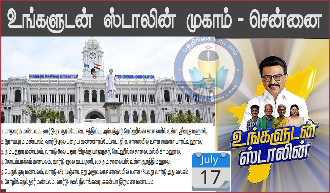 சென்னையில் தினசரி 6 இடங்களில் முகாம்கள் நடைபெற்று வருகின்றது. இந்த நிலையில், பெருநகர சென்னை மாநகராட்சிப் பகுதிகளில் உங்களுடன் ஸ்டாலின் திட்ட முகாம் நடைபெறும் விவரங்களை சென்னை மாநகராட்சி வெளியிட்டுள்ளது. அதன் விவரம் வருமாறு:=