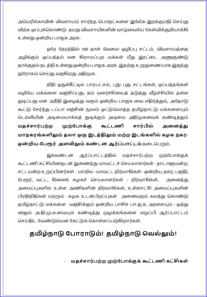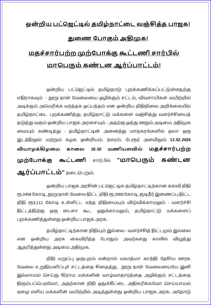 விவசாயிகள் வயிற்றில் அடிக்கும் அமெரிக்க வர்த்தக ஒப்பந்தம் என ஒன்றிய நிதிநிலை அறிக்கையில் தமிழ்நாட்டை புறக்கணித்து, தமிழ்நாட்டு மக்களை வஞ்சித்து வளர்ச்சியைத் தடுத்து வரும் ஒன்றிய பாஜக அரசையும் – அதற்கு ஒத்து ஊதும் அடிமை அதிமுக வையும் கண்டித்து – தமிழ்நாட்டின் அனைத்து மாநகரங்களில் தலா ஒரு இடத்திலும் மற்றும் கழக ஒன்றியம், நகரம், பேரூர் அளவிலும் 12.02.2026 வியாழக்கிழமை காலை 10.30 மணியளவில் மதச்சார்பற்ற முற்போக்கு கூட்டணி சார்பில் “மாபெரும் கண்டன ஆர்ப்பாட்டம்” நடைபெறும். தமிழ்நாடு போராடும்! தமிழ்நாடு வெல்லும்! என கூறப்பட்டு உள்ளது.