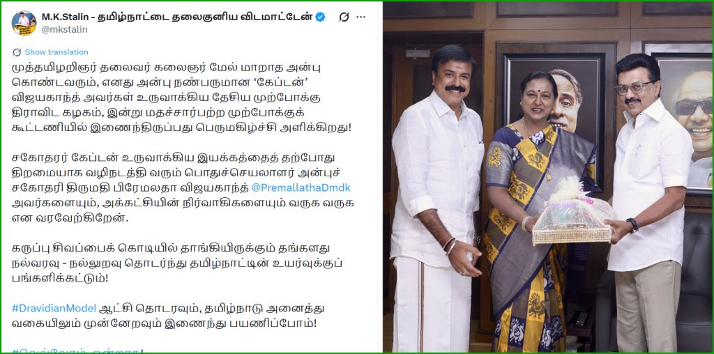 இதையடுத்து, திராவிட மாடல் ஆட்சி தொடர, இணைந்து பயணிப்போம்; தே.மு.தி.க கட்சியை கூட்டணி வரவேற்று ஸ்டாலின் தனது சமூக வலைதளத்தில் பதிவிட்டுள்ளார். கேப்டன்’ விஜயகாந்த் அவர்கள் உருவாக்கிய தேசிய முற்போக்கு திராவிட கழகம், இன்று மதச்சார்பற்ற முற்போக்குக் கூட்டணியில் இணைந்திருப்பது பெருமகிழ்ச்சி அளிக்கிறது என ஸ்டாலின் பதிவிட்டுள்ளார்.