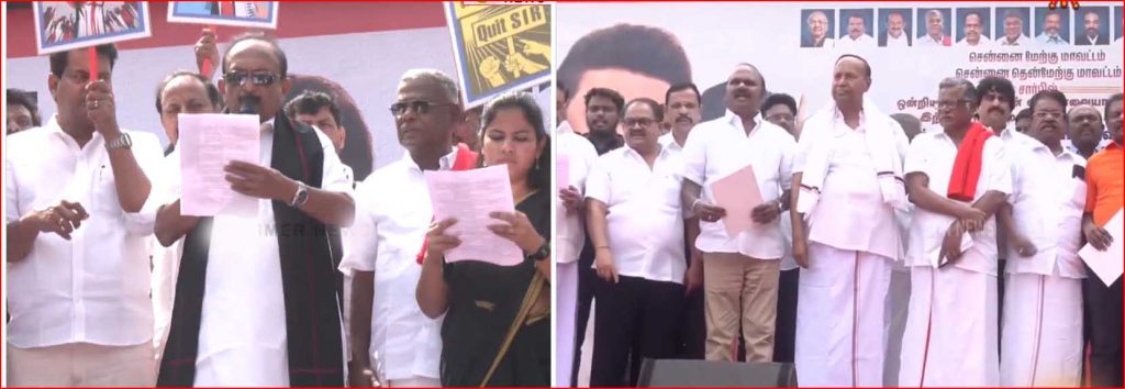 தங்கசாலை பகுதியில் கிழக்கு மாவட்ட திமுக சார்பில் நடைபெற்ற கண்டன ஆர்ப்பாட்டத்தில் ம.தி.மு.க. பொதுச் செயலாளர் வைகோ, மார்க்சிஸ்ட் கம்யூனிஸ்ட் கட்சியின் மாநில செயலாளர் சண்முகம், விடுதலை சிறுத்தைகள் கட்சி தலைவர் தொல். திருமாவளவன் ஆகியோர் பங்கேற்று உரையாற்றினர்.
