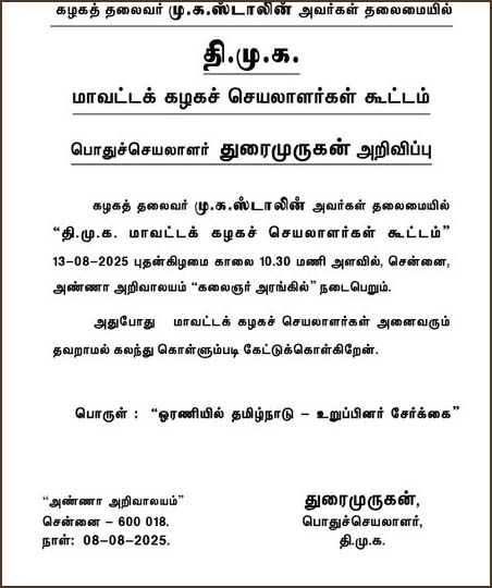 இது தொடர்பாக கட்சியின் பொதுச் செயலாளார் துரைமுருகன் வெளியிட்டுள்ள அறிக்கையில், “கழகத் தலைவர் மு.க.ஸ்டாலின் தலைமையில் தி.மு.க. மாவட்டக் கழகச் செயலாளர்கள் கூட்ட ம் 13-08-2025 புதன்கிழமை காலை 10.30 மணி அளவில், சென்னை, அண்ணா அறிவாலயம் ‘கலைஞர் அரங்கில்’ நடைபெறும். அதுபோது மாவட்டக் கழகச் செயலாளர்கள் அனைவரும் தவறாமல் கலந்து கொள்ளும்படி கேட்டுக்கொள்கிறேன்.”