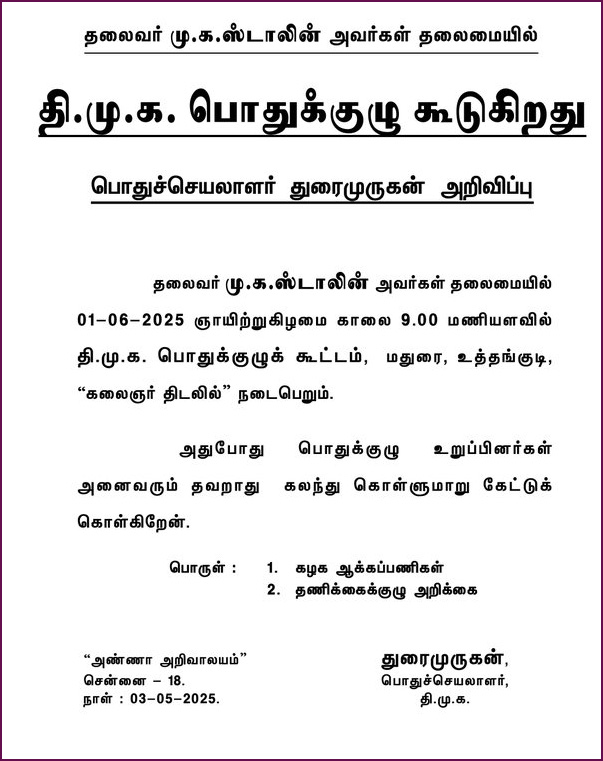 இதுதொடர்பாக அவர் வெளியிட்டுள்ள அறிடிவிப்பில், மதுரை உத்தங்குடி கலைஞர் திடலில் ஜூன் 1ம் தேதி காலை 9 மணிக்கு திமுக பொதுக்குழு கூட்டம் நடைபெறும் என தெரிவித்துள்ளார். மேலும், திமுக பொதுக்குழு கூட்டத்தில் கட்சியின் ஆக்கப்பணிகள், தணிக்கைக்குழு அறிக்கைகள் குறித்து திமுக பொதுக்குழுவில் விவாதிக்கப்படும் என குறிப்பிட்டுள்ளார்.