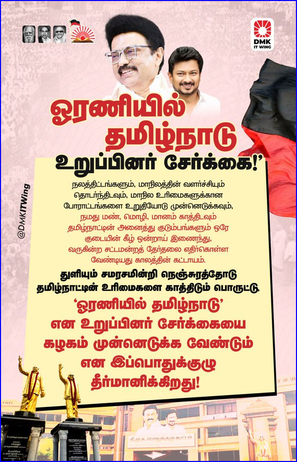 அந்த தீர்மானத்தில்,   “எல்லாருக்கும் எல்லாம்’ எனும் திராவிட மாடல் ஆட்சியின் திட்டங்கள் அனைத்தும் சிறப்பாக செயல்படுத்தப்பட்டு வருவதால், ஒவ்வொரு வீட்டிலும் ஒருவராவது ஏதேனும் ஒரு திட்டத்தில் பயனாளியாக உள்ளனர். இத்தகைய நலத்திட்டங்களும், மாநிலத்தின் வளர்ச்சியும், தொடர்ந்திடவும், மாநில உரிமைக்கான போராட்டங்களை உறுதியுடன் முன்னெடுக்கவும், நமது மண், மொழி, மானம் காத்திடவும் தமிழ்நாட்டின் அனைத்து குடும்பங்களும் ஒரு குடையின் கீழ் ஒன்றாய் இணைத்து, வருகின்ற சட்டமன்ற தேர்தலை எதிர்கொள்ள வேண்டியது காலத்தின் கட்டாயமாக உள்ளது. துளியும் சமரசமின்றி நெஞ்சுரத்தோடு தமிழ்நாட்டின் உரிமைகளைக் காத்திடும் பொருட்டு “ஓரணியில் தமிழ்நாடு” என உறுப்பினர் சேர்க்கையை கழகம் முன்னெடுக்க வேண்டும் என இப்பொதுக்குழு தீர்மானிக்கிறது.