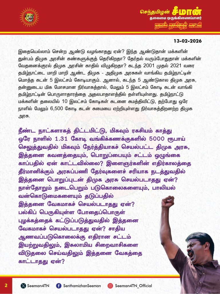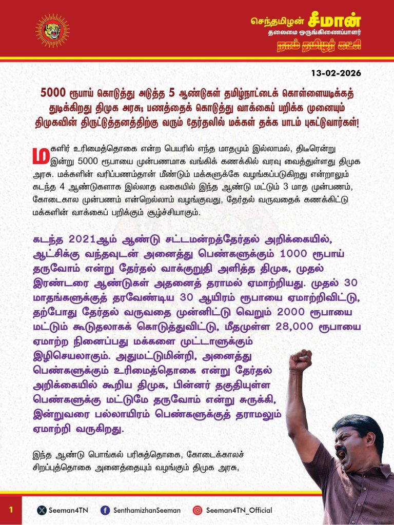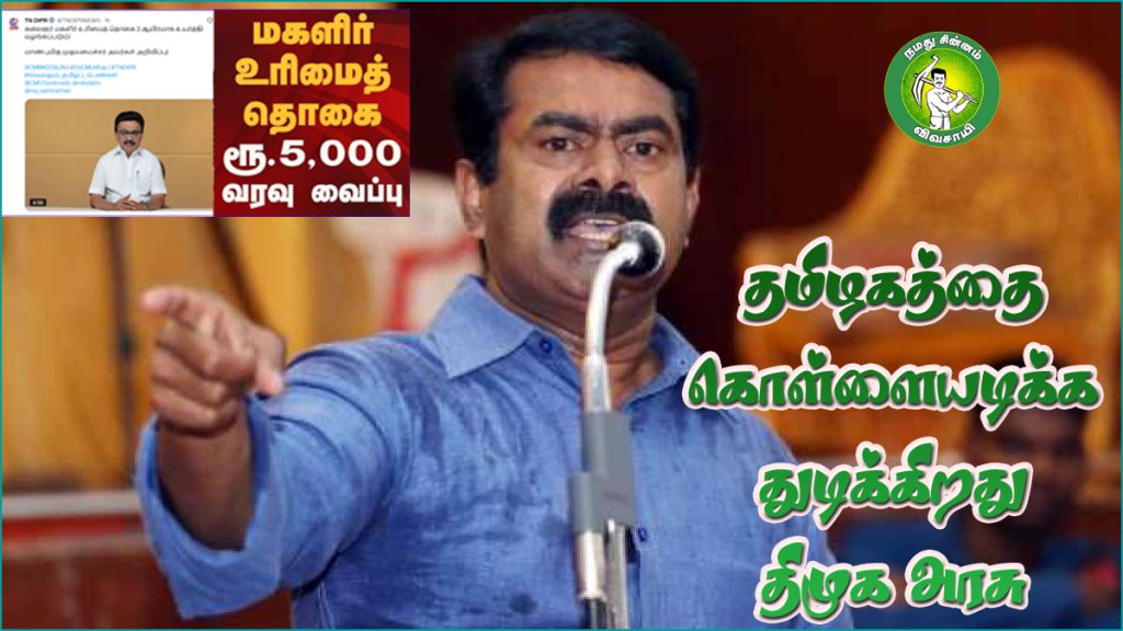 சென்னை: திமுக அரசு மகளிருக்கு 5000 ரூபாய் கொடுத்து அடுத்த 5 ஆண்டுகள் தமிழ்நாட்டைக் கொள்ளையடிக்கத் துடிக்கிறது என நாம் தமிழர் கட்சி தலைவர் சீமான் கடுமையாக விமர்சனம் செய்துள்ளது.