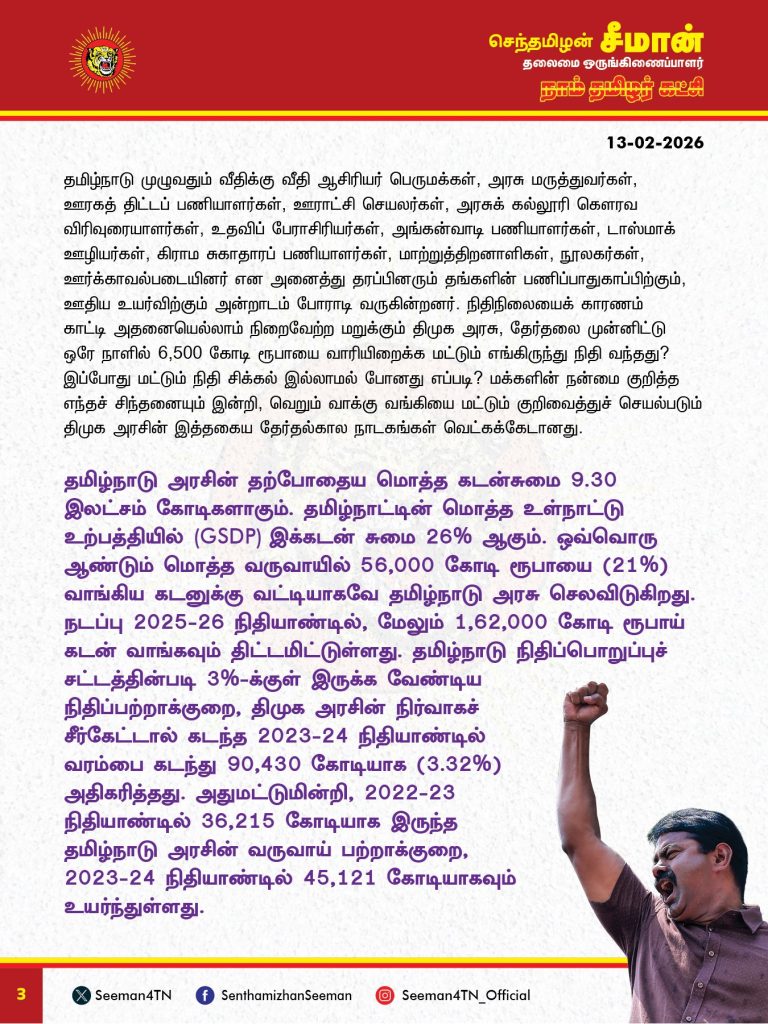 கடந்த 2001 முதல் 2021 வரை தமிழ்நாட்டை மாறி மாறி ஆண்ட திமுக – அதிமுக அரசுகள் வாங்கிய தமிழ்நாட்டின் மொத்த கடன் 5 இலட்சம் கோடியாகும். ஆனால், கடந்த 5 ஆண்டுகால திமுக அரசு, தன்னுடைய மிக மோசமான நிர்வாகத்தால், மேலும் 5 இலட்சம் கோடி கடன் வாங்கி தமிழ்நாட்டின் பொருளாதாரத்தை அதலபாதாளத்தில் தள்ளியுள்ளது.