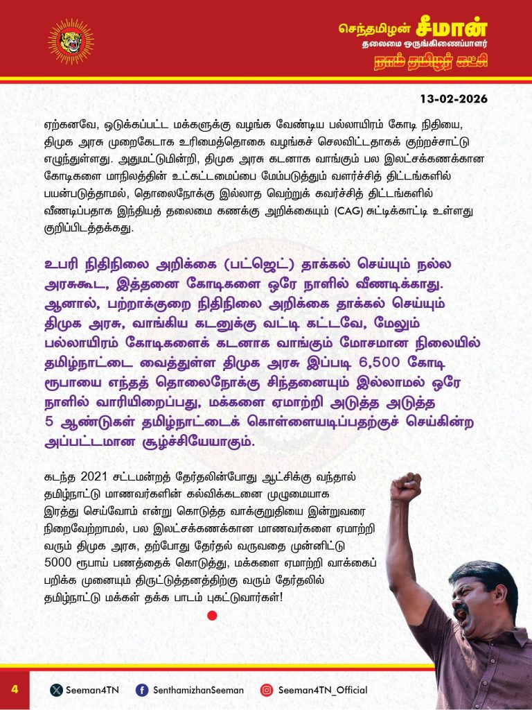 உபரி நிதிநிலை அறிக்கை (பட்ஜெட்) தாக்கல் செய்யும் நல்ல அரசுகூட, இத்தனை கோடிகளை ஒரே நாளில் வீணடிக்காது. ஆனால், பற்றாக்குறை நிதிநிலை அறிக்கை தாக்கல் செய்யும் திமுக அரசு, வாங்கிய கடனுக்கு வட்டி கட்டவே, மேலும் பல்லாயிரம் கோடிகளைக் கடனாக வாங்கும் மோசமான நிலையில் தமிழ்நாட்டை வைத்துள்ள திமுக அரசு இப்படி 6,500 கோடி ரூபாயை எந்தத் தொலைநோக்கு சிந்தனையும் இல்லாமல் ஒரே நாளில் வாரியிறைப்பது, மக்களை ஏமாற்றி அடுத்த அடுத்த 5 ஆண்டுகள் தமிழ்நாட்டைக் கொள்ளையடிப்பதற்குச் செய்கின்ற அப்பட்டமான சூழ்ச்சியேயாகும்.