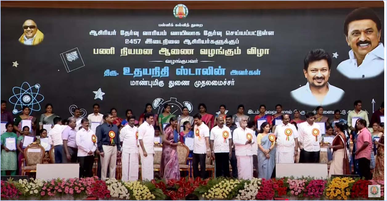 தமிழ்நாட்டில்  உள்ள அரசு பள்ளிகளுக்கு தேர்வு செய்யப்பட்டுள்ள 2,430 இடைநிலை ஆசிரியர்களுக்கு பணி நியமன ஆணைகள் வழங்கும் நிகழ்ச்சி சென்னை நேரு விளையாட்டரங்கில் நடைபெற்றது. இதில் கலந்துகொண்ட  துணை முதலமைச்சர் உதயநிதி ஸ்டாலின்  தேர்வு செய்யப்பட்ட ஆசிரியர்களுக்கு பணி நியமன ஆணைகளை  வழங்கினார்.