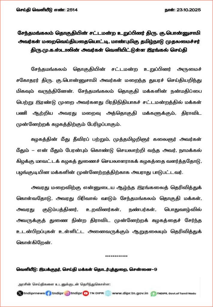 இது தொடர்பாக அவர் தனது எக்ஸ் சமூக வலைதளத்தில் வெளியிட்டுள்ள  இரங்கல் குறிப்பில், “சேந்தமங்கலம் தொகுதியின் சட்டமன்ற உறுப்பினர் கு.பொன்னுசாமி மறைந்த துயரச் செய்தியறிந்து மிகவும் வருந்தினேன். சேந்தமங்கலம் தொகுதி மக்களின் நன்மதிப்பை பெற்று இரண்டு முறை அவர்களது பிரதிநிதியாகச் சட்டமன்றத்தில் மக்கள் பணி ஆற்றிய அவரது மறைவு அத்தொகுதி மக்களுக்கும், திராவிட முன்னேற்றக் கழகத்திற்கும் பேரிழப்பாகும்.