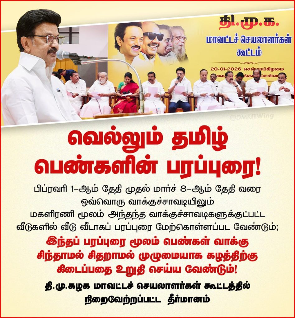 கலைஞர் மகளிர் உரிமைத் தொகை, கட்டணமில்லா விடியல் பேருந்து பயணம், தோழி விடுதிகள், புதுமைப்பெண் திட்டம், மகளிர் சுய உதவிக் குழுக்கள் என எண்ணற்ற மகளிர் மேம்பாட்டு திட்டங்களை செயல்படுத்தி, தமிழ்நாட்டு பெண்களை உலகளவில் ‘வெல்லும் தமிழ்ப்பெண்களாக’ மாற்றியுள்ள தலைவர் மு.க.ஸ்டாலின் தலைமையில் 2026 தேர்தலில் வென்று திராவிட மாடல் 2.0 அமைந்திடும் வகையில், நமது திராவிட மாடல் அரசு பெண்களுக்குச் செய்துள்ள சாதனைத்திட்டங்களைப் பெண்களிடம் எடுத்துக்கூறி மகளிரின் முழுமையான ஆதரவு கழகத்திற்கு மட்டுமே என்ற நிலையை உறுதி செய்திட வேண்டும் என மாவட்டக் கழகச் செயலாளர்கள் கூட்டம் தீர்மானிக்கிறது.