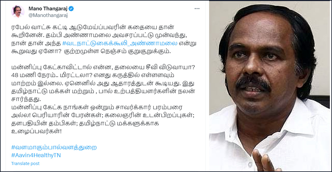தமிழக பாஜக தலைவர் அண்ணாமலை தன்னுடைய எக்ஸ் தளத்தில் நேற்று வெளியிட்டிருந்த பதிவில், “அமைச்சர் மனோ தங்கராஜ், இன்றைய உங்கள் செய்தியாளர்கள் சந்திப்பில், வடமாநில பால் உற்பத்தி நிறுவனங்களிடம் கையூட்டு பெற்று ஆவின் நிறுவனத்திற்கு எதிராக நான் செயல்படுவதாகக் குற்றம் சாட்டியிருந்தீர்கள். உங்களுக்கு 48 மணிநேரம் அவகாசம் தருகிறேன். ஊழல் திமுக அரசின் முழு கட்டுப்பாட்டில் உள்ள தமிழக காவல்துறை மூலமாக விசாரித்து, நீங்கள் முன்வைத்த குற்றச்சாட்டிற்கான ஆதாரங்களைப் பொதுவெளியில் வெளியிடவேண்டும். உங்களால் நிரூபிக்க முடியவில்லையெனில், தவறான தகவலை பகிர்ந்தமைக்கு மன்னிப்பு கோரி, உங்கள் அமைச்சர் பதவியை ராஜினாமா செய்ய வேண்டும். நீங்கள் அமைச்சராக தொடர்வது, தமிழக மக்களுக்கும் ஆவின் நிறுவனத்திற்கும் பெரும் சாபக்கேடு” என்று கூறியிருந்தார்.