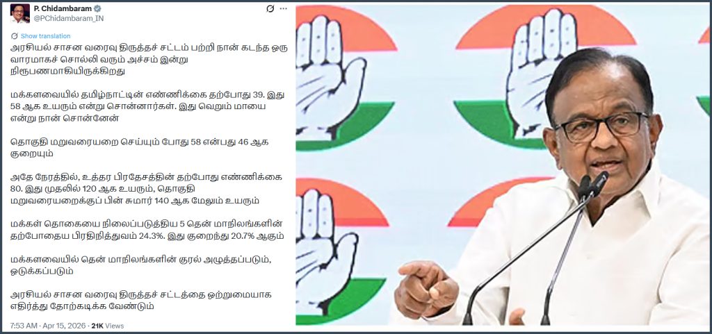 இதுதொடர்பாக, முன்னாள் மத்திய அமைச்சரும், காங்கிரஸ் மூத்த தலைவருமான ப.சிதம்பரம் எக்ஸ் தள பக்கத்தில் வெளியிட்டுள்ள பதிவில், அரசியல் சாசன வரைவு திருத்தச் சட்டம் பற்றி நான் கடந்த ஒரு வாரமாகச் சொல்லி வரும் அச்சம் இன்று நிரூபணமாகியிருக்கிறது.