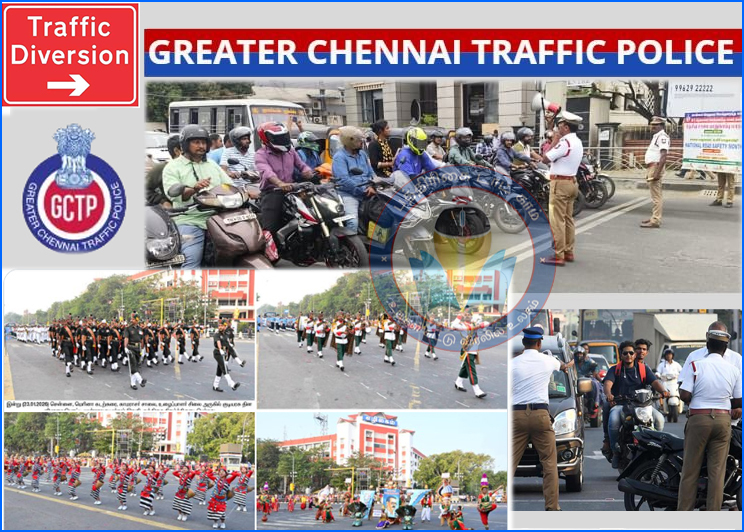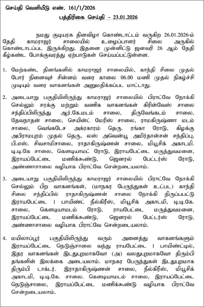 26-ம் தேதி அன்று கடற்கரை காமராஜர் சாலையில், காந்தி சிலை முதல் போர் நினைவுச் சின்னம் வரை காலை 6 மணி முதல் நிகழ்ச்சி முடியும் வரை வாகனங்கள் அனுமதிக்கப்பட மாட்டாது.