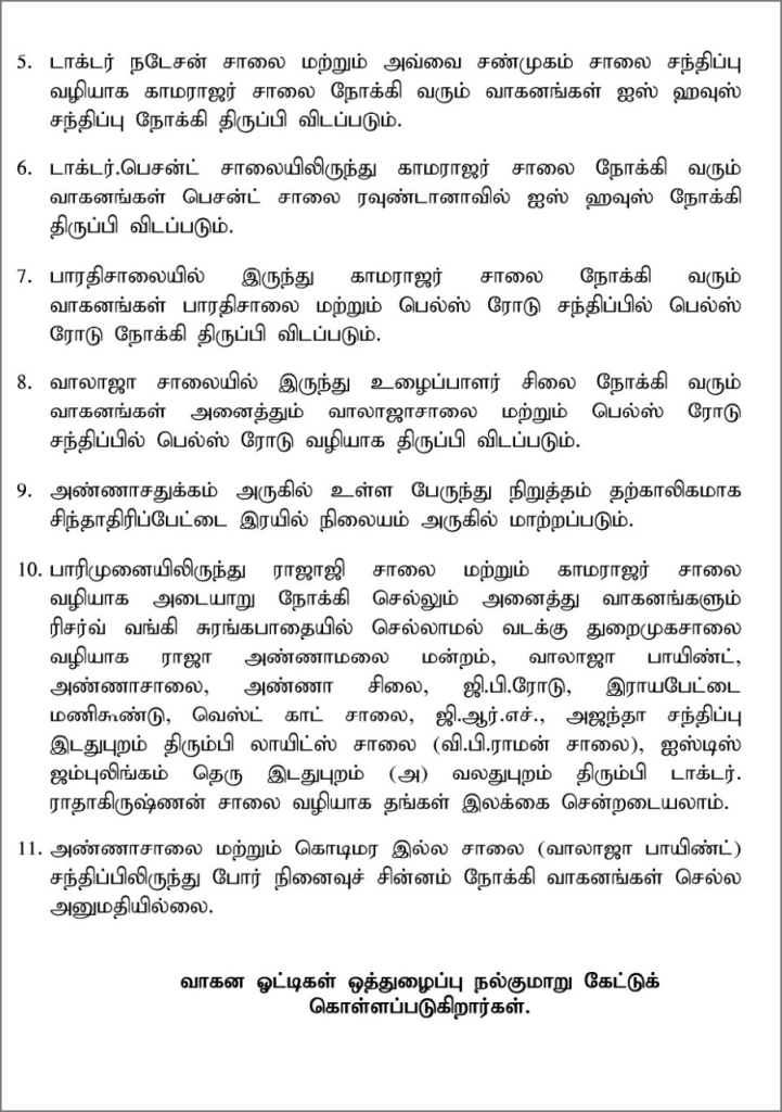 பாரதிசாலையில் இருந்து காமராஜர் சாலை நோக்கி வரும் வாகனங்கள் பாரதிசாலை மற்றும் பெல்ஸ் ரோடு சந்திப்பில் பெல்ஸ் ரோடு நோக்கி திருப்பி விடப்படும். வாலாஜா சாலையில் இருந்து உழைப்பாளர் சிலை நோக்கி வரும் வாகனங்கள் அனைத்தும் வாலாஜாசாலை மற்றும் பெல்ஸ் ரோடு சந்திப்பில் பெல்ஸ் ரோடு வழியாக திருப்பி விடப்படும். அண்ணாசதுக்கம் அருகில் உள்ள பேருந்து நிறுத்தம் தற்காலிகமாக சிந்தாதிரிப்பேட்டை ரயில் நிலையம் அருகில் மாற்றப்படும்.