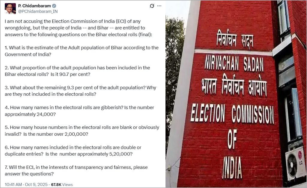 சென்னை: பீகார் சட்டமன்ற தேர்தல் தேதிகள் அறிவிக்கப்பட்டு இன்று வேட்புமனுத் தாக்கல் தொடங்கி உள்ள நிலையில், இந்திய தேர்தல் ஆணையத்திற்கு மூத்த காங்கிரஸ் தலைவரும், முன்னாள் அமைச்சருமான ப.சிதம்பரம் 7 கேள்விகளை எழுப்பி உள்ளார்.
