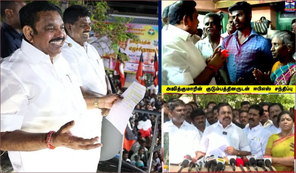 மேலும், சிவகங்கையில் போலீசாரால் அடித்து கொல்லப்பட்ட திருப்புவனம் அஜித் குமார் வீட்டிற்கு சென்ற குடும்பத்தினரை சந்தித்து ஆறுதல் கூறினார். அவரது தாய் மற்றும் சகோதரர் நவீன் குமாருக்கு ஆறுதல் கூறினார். மேலும் அவரது வீட்டில் இருந்த அஜித் குமாரின் புகைப்படத்துக்கு மாலை அணிவித்து பூக்களை தூவி மரியாதை செலுத்தினார். அதிமுக சார்பாக ரூ.5 லட்சம் நிதி உதவியினையும் செய்தார்.