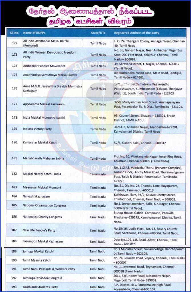 அரசியல் கட்சி தொடங்கி ஆறு ஆண்டுகள் தேர்தல் களத்தில் பங்கு பெறாத, மற்றும் அரசியல் கட்சியாக பதிவு செய்யும் போது வழங்கிய அலுவகத்தில் இயங்காத அரசியல் கட்சியை அடையாளம் கண்டு அதன் பட்டியலை இந்திய தேர்தல் ஆணையம் வெளியிட்டுள்ளது.