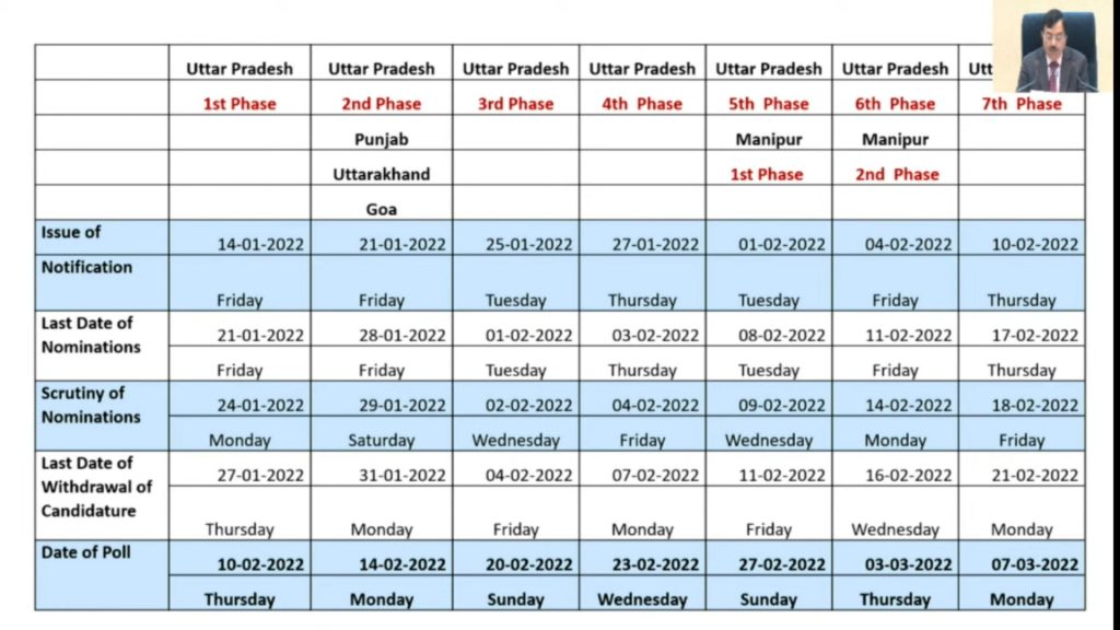 மேலும் பேசிய அவர், உத்தரபிரதேசத்திற்கு ஏழு கட்டமாக தேர்தல் நடத்தப்பட உள்ளது என்றும், மணிப்பூருக்கு 2 மற்றும் பஞ்சாப் கட்டமாக தேர்தல் நடத்தப்பட உள்ளது என்றும், உத்தரகண்ட் மற்றும் கோவாவுக்கு ஒரே கட்டமாக தேர்தல் நடைபெறும் என்றும் அவர் கூறினார்.