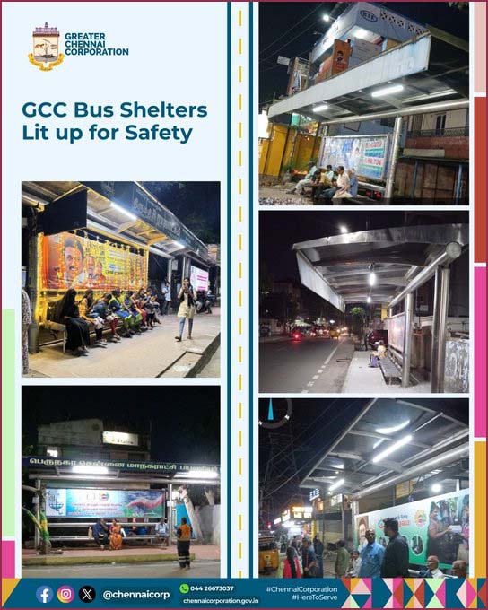 மேலும், கட்டுதல், பராமரித்தல் மற்றும் ஒப்படைத்தல் (BOT) முறையில் பராமரிப்பில் உள்ள 637 நிழற்குடைகளுக்கும் BOT ஒப்பந்ததாரர்கள் மூலம் மின்விளக்குகள் அமைக்கப்படும். இதன் காரணமாக, பெருநகர சென்னை மாநகராட்சியில் உள்ள பேருந்து நிறுத்தங்கள் மின்விளக்கு வசதி உள்ளிட்ட முழுமையான வசதிகள் மற்றும் பாதுகாப்பு நிறைந்த பேருந்து நிறுத்தமாக புதுப்பொலிவினைப் பெற்றுள்ளது.